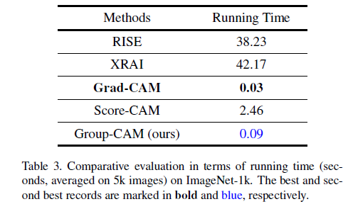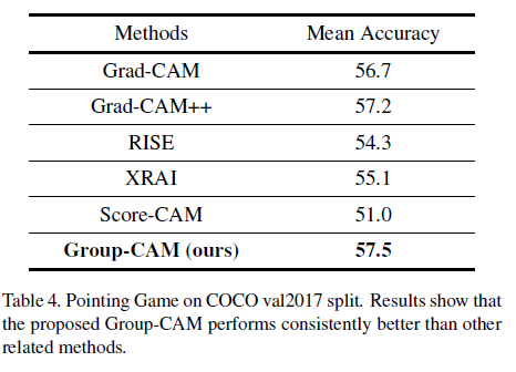 Table 3은 running time을 보여주고 있는데, 이를 보면 Group-CAM이 score-CAM에 비해서 매우 효율적으로 CAM을 형성하고 있음을 알 수 있다. 다음 Table 4는 pointing game에서도 Group-CAM이 상당히 높은 성능을 갖는 다는 것을 보여주고 있다.
