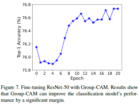 4) 앞서 이야기한 것 처럼, Group-CAM의 응용으로 저자는 data augmentation 방법으로 fine-tuning하는 방법을 소개하였다. 저자는 data augmentation 생성시에, $w^c$를 계산하는 과정과 de-noising 하는 과정을 모두 제외하였고, masking $M$을 mean value를 사용해서 binarize하였다. (이렇게 한 이유는 sample을 만들 때, 속도를 향상시키기 위함이다.) 학습을 하면서 좀 더 나은 blurred input $\tilde I_0$를 만들어내고, 이는 결과적으로 성능 향상에 도움이 되었다.